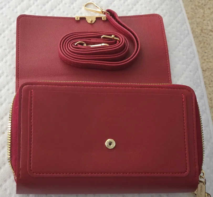 Dedicated places for everything: interior slot pocket, cell-phone pocket, interior zipper pocket, interior compartment, zipper pouch, coin pocket, note compartment, photo holder, and card holder.